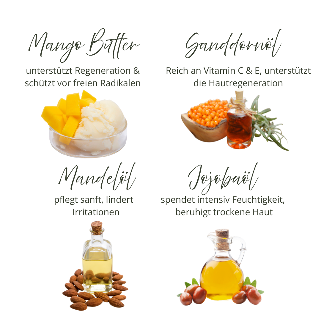 - Lipidpflege: Mandelöl, Jojobaöl & Mangobutter für geschmeidige Haut.
